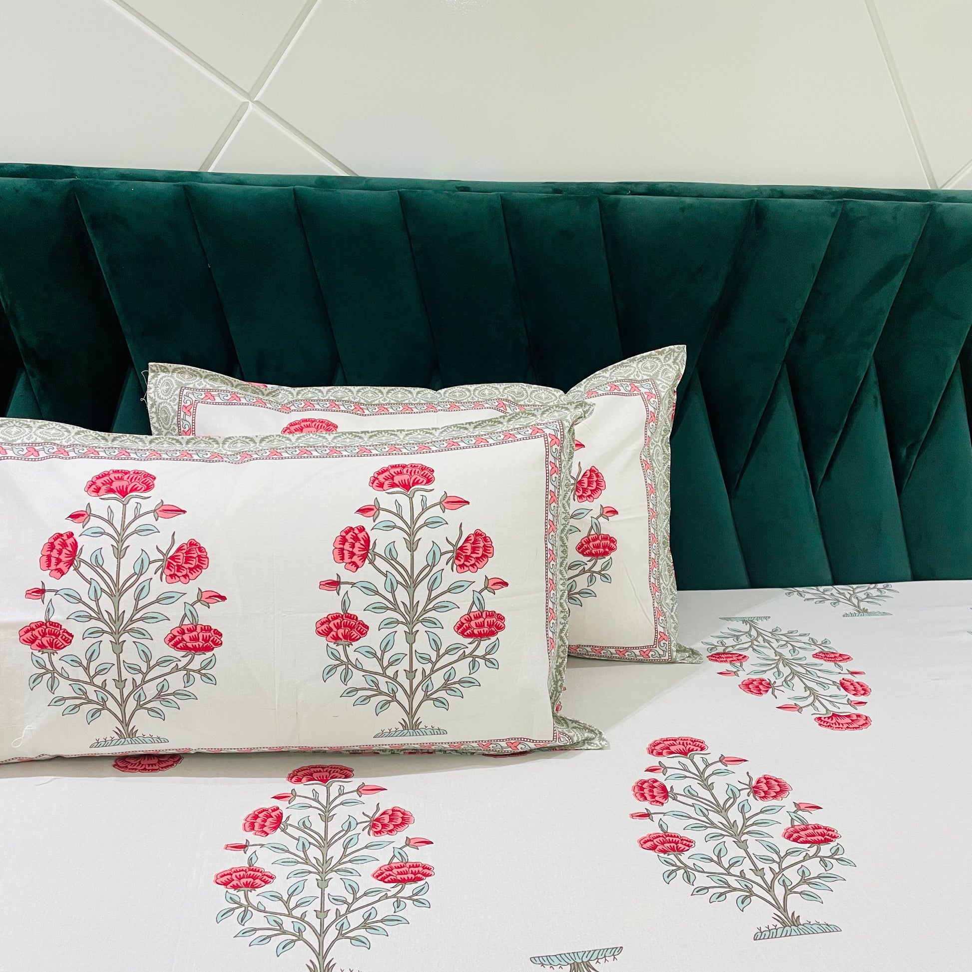 Color : White Base with Pink and Green Floral Bunch Pattern and Floral Embroidery at the end with Co-ordinated Pillow Covers