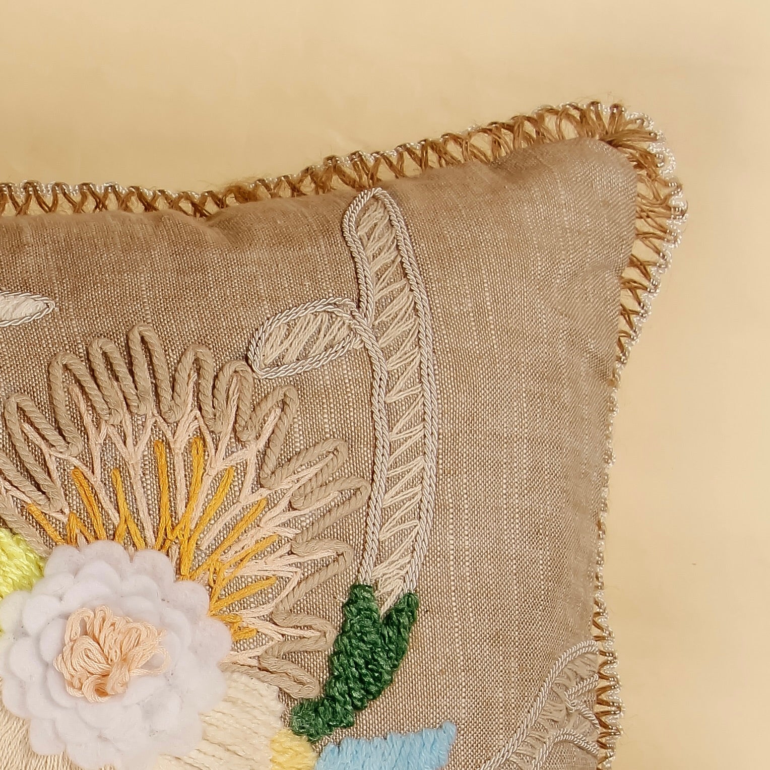 Pattern : Lite Jute with multicolor floral pattern and beige bird design in the centre with golden frills at the corner