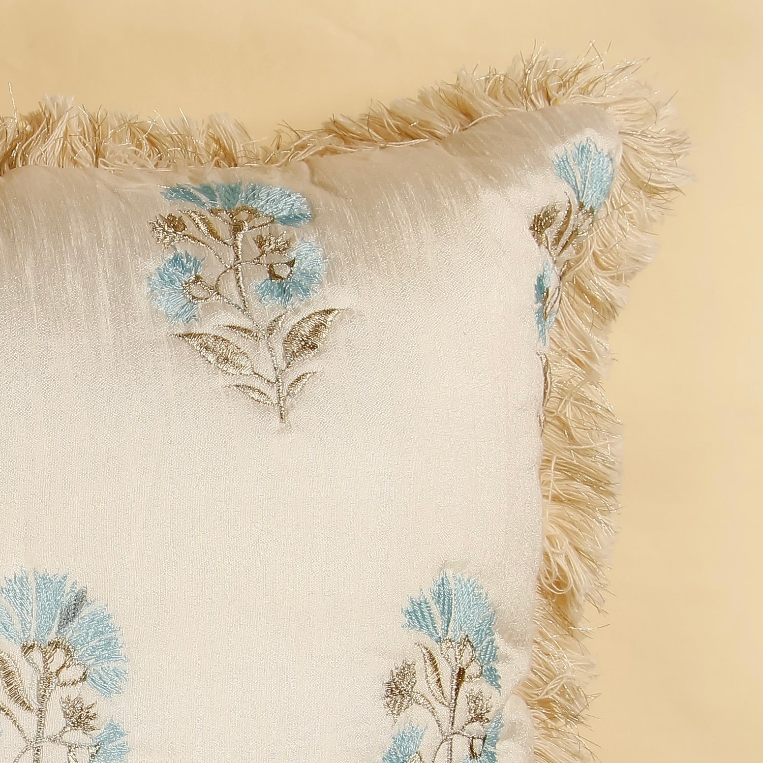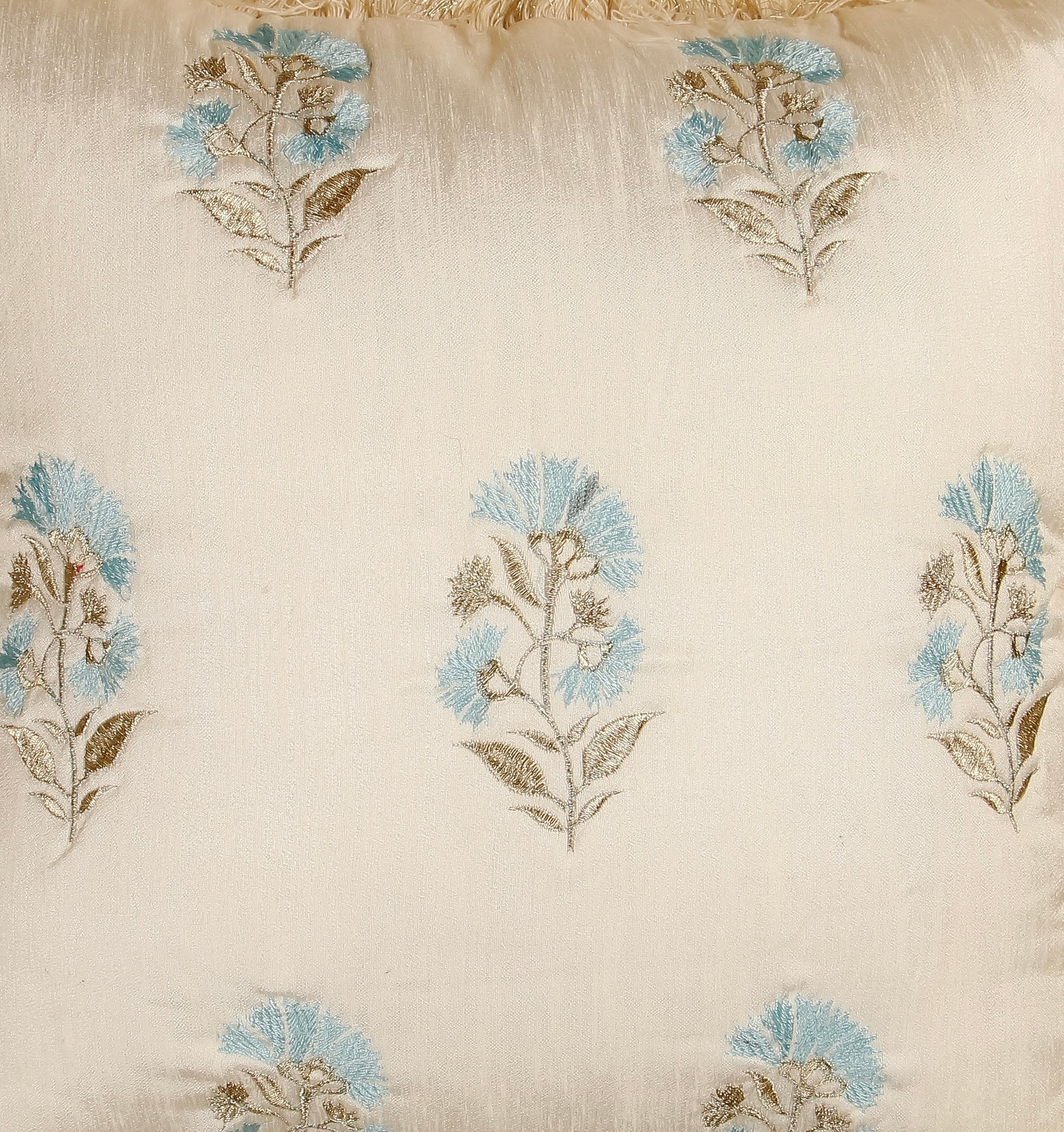 Pattern : Off White Beige with Blue floral bunch pattern and frills on the corner on Silk Fabric